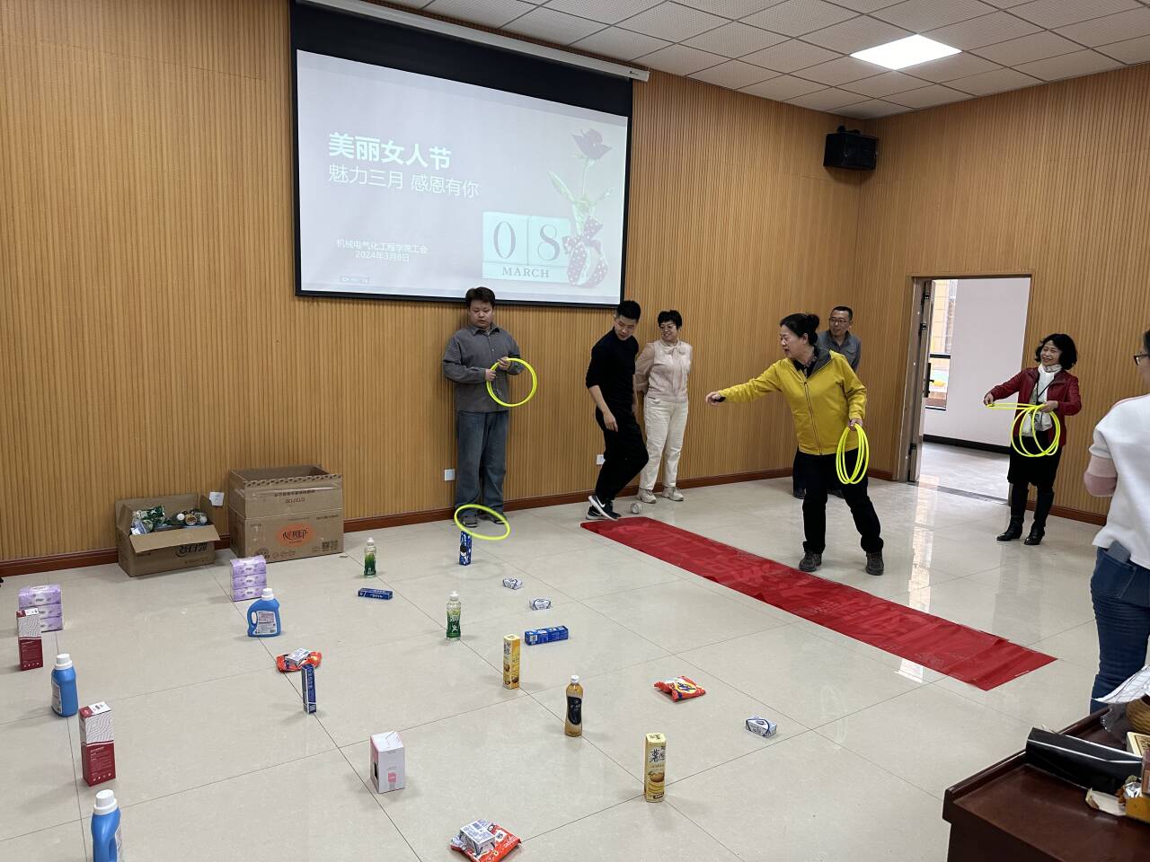 阳春三月,春意盎然,第114个“三八”国际劳动妇女节来临之际,机械电气化工程学院工会在D106成功开展一系列趣味活动,其中套圈圈、耐力颠球等游戏尤为热烈。在大家们的欢声笑语中,各位老师卸下生活工作的疲惫,享受此刻浓浓的节日氛围。