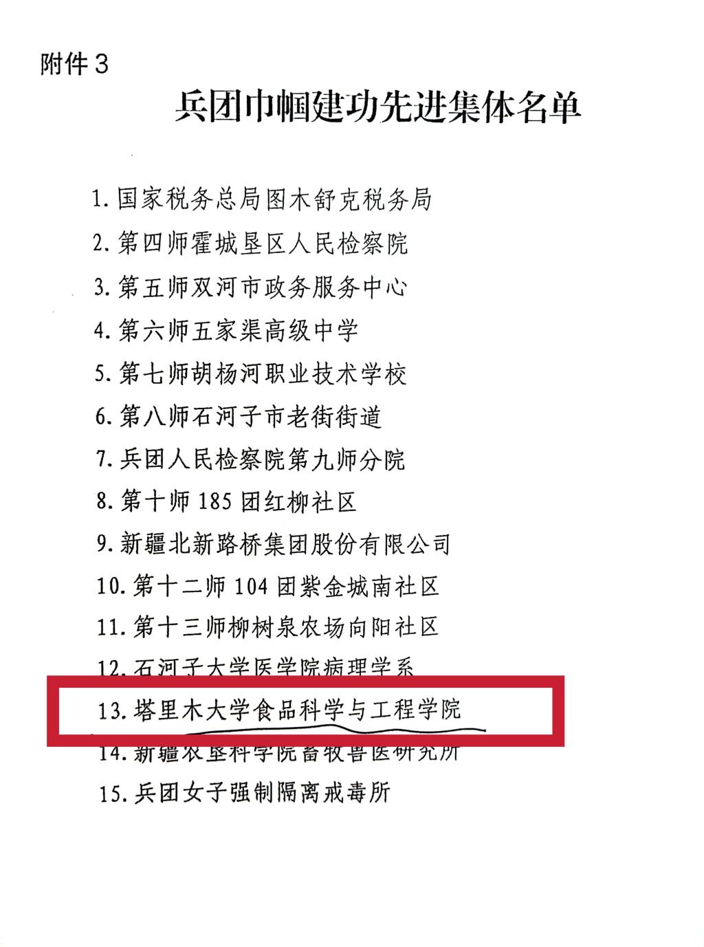 为表彰先进、树立榜样,充分发挥先进集体和先进个人的示范带动作用,引领广大各族妇女积极投身中国式现代化兵团实践新篇章,更好地履行兵团维稳戍边职责使命,兵团妇联决定,授予15个单位兵团巾帼建功先进集体称号,授予30名同志兵团巾帼建功标兵称号。我校食品科学与工程学院荣获兵团巾帼建功先进集体称号,园艺与林学学院张锐教授、生命科学与技术学院聂竹兰教授荣获兵团巾帼建功标兵称号。