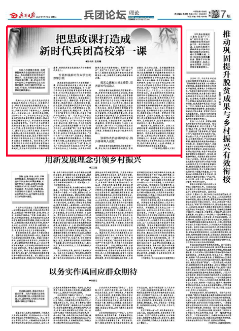 办好人民满意的教育,培养德智体美劳全面发展的新时代戍边人,是兵团高校优良传统和不懈追求。把思政课打造成为新时代兵团高校第一课,使兵团大学生牢固树立中国特色社会主义的共同理想,形成正确的世界观、人生观、价值观,为终身发展奠定思想政治素质基础。