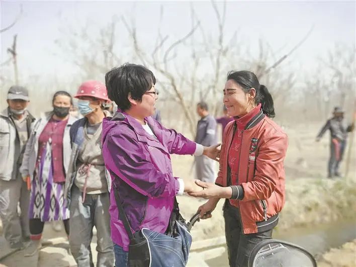 在一次现场培训后,古丽胡玛尔(右)热情地拉着张锐的手,连声表示感谢(资料图片)。张锐 提供