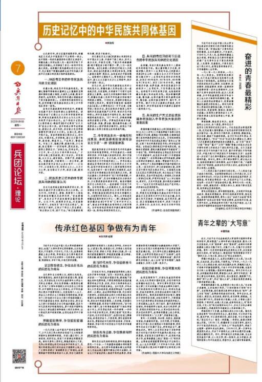 一代代兵团人在中国共产党的坚强领导下,以平凡而又伟大的劳动创造了巨大的物质财富和宝贵的精神财富。兵团人勠力同心、开拓进取,艰苦创业,促进了兵团事业的蓬勃发展。新时代青年人要牢记,辉煌成就来之不易,是伟大的祖国让我们沐浴在和平的阳光下,是强大的祖国让我们成长在这片温暖的土地上。广大青年要树立“祖国需要至上”的理念,在拼搏奉献中领悟青春的奋斗之美,将自己满腔的爱国情怀体现到与人民群众同呼吸、共命运中去,以爱国之情,践报国之行,用青春之我创造青春之兵团、青春之中国、青春之民族,用一生践行爱国爱疆信仰,争做爱国爱疆、担当奉献、扎根边疆、献身边疆的新时代戍边人。
