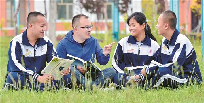 图① 黑龙江省援疆教师韩梦雷(左二)与十师北屯中学的学生们进行交流(资料图片)。黑龙江省投入援疆资金1.82亿元,柔性引进教育人才 178 人,助力十师北屯市培养师资队伍,提升教育教学水平。 兵团日报全媒体记者 陈洋 摄
