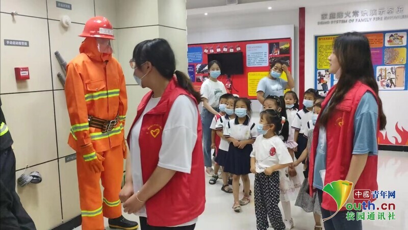 图为志愿者带领小朋友观看消防员模型。中国青年网通讯员俞芳荣 摄。