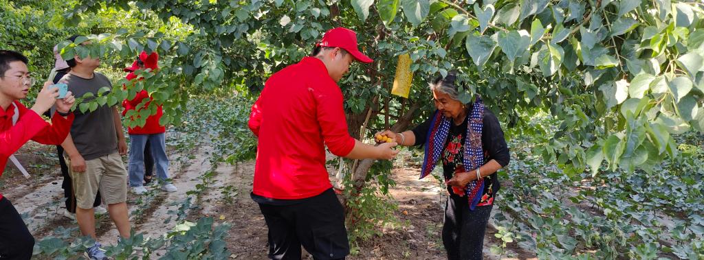 图为老奶奶为实践团成员摘李子。中国青年网通讯员 段雪 摄