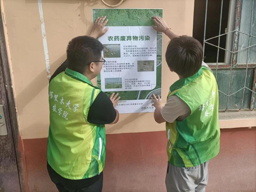 喜迎二十大,永远跟党走,奋进新征程。为了让阿拉尔周边团场村民了解农药废弃物对水源的污染、生物的危害以及对生态的影响,提高他们对农药废弃物回收利用的意识,7月7日,开云app体育网页登录不上 农学院农药废弃物科普队在队长苑春林的带领下,前往十一团进行农药废弃物相关知识宣传。宣传工作开始,队长去征求了十一团七连连长的意见,并在他的陪同下,对有关农药废弃物污染的宣传海报进行张贴,海报上的内容包括农药废弃物对水源、生物和生态的影响三部分内容,让当地村民了解到了废弃物的危害。