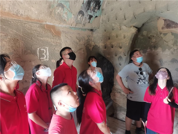 图为团队成员观看石窟上方的壁画。中国青年网通讯员 马美 摄