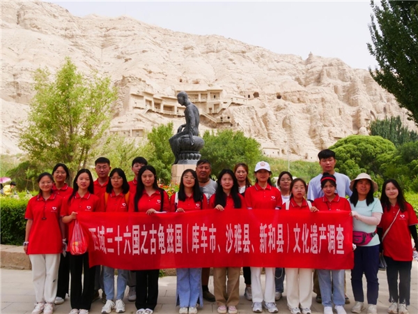 图为团队成员在克孜尔石窟合影。中国青年网通讯员 龙莉群 摄