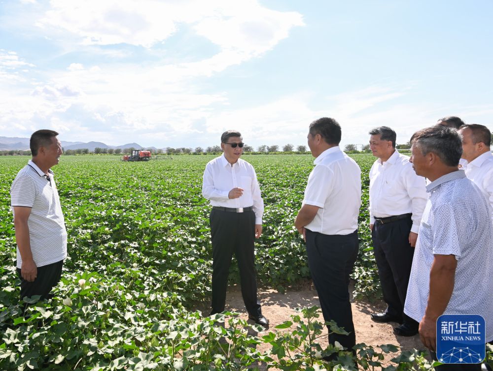 7月12日至15日,中共中央总书记、国家主席、中央军委主席习近平在新疆考察。这是13日下午,习近平在新疆生产建设兵团八师一四三团农一连棉花种植基地考察。新华社记者 谢环驰 摄