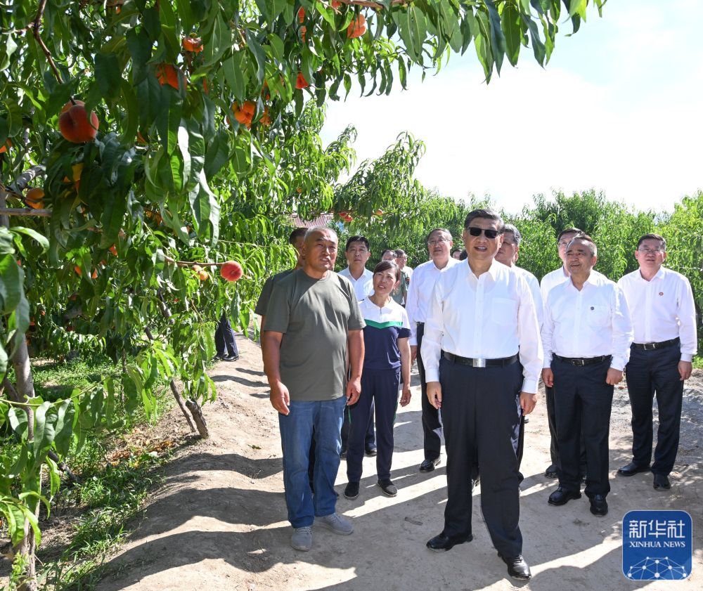 7月12日至15日,中共中央总书记、国家主席、中央军委主席习近平在新疆考察。这是13日下午,习近平在新疆生产建设兵团八师一四三团九连蟠桃种植园考察。新华社记者 谢环驰 摄