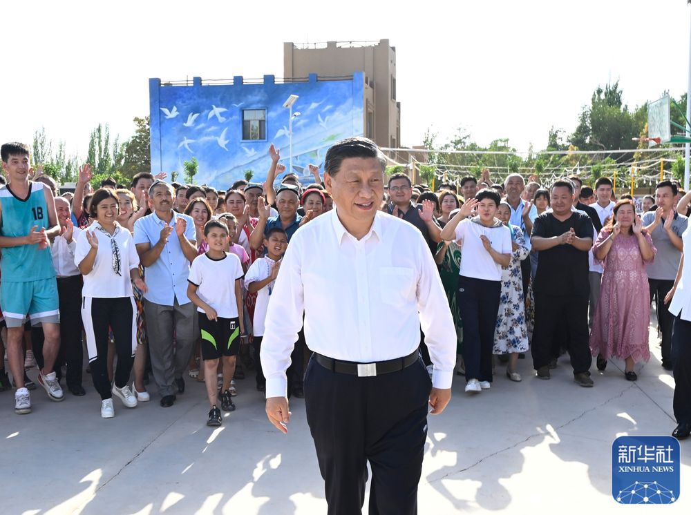 7月12日至15日,中共中央总书记、国家主席、中央军委主席习近平在新疆考察。这是13日上午,习近平在乌鲁木齐市天山区固原巷社区考察时,同各族群众在一起。新华社记者 谢环驰 摄