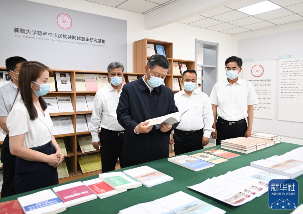 7月12日至15日,中共中央总书记、国家主席、中央军委主席习近平在新疆考察。这是12日下午,习近平在新疆大学铸牢中华民族共同体意识研究基地考察。新华社记者 谢环驰 摄
