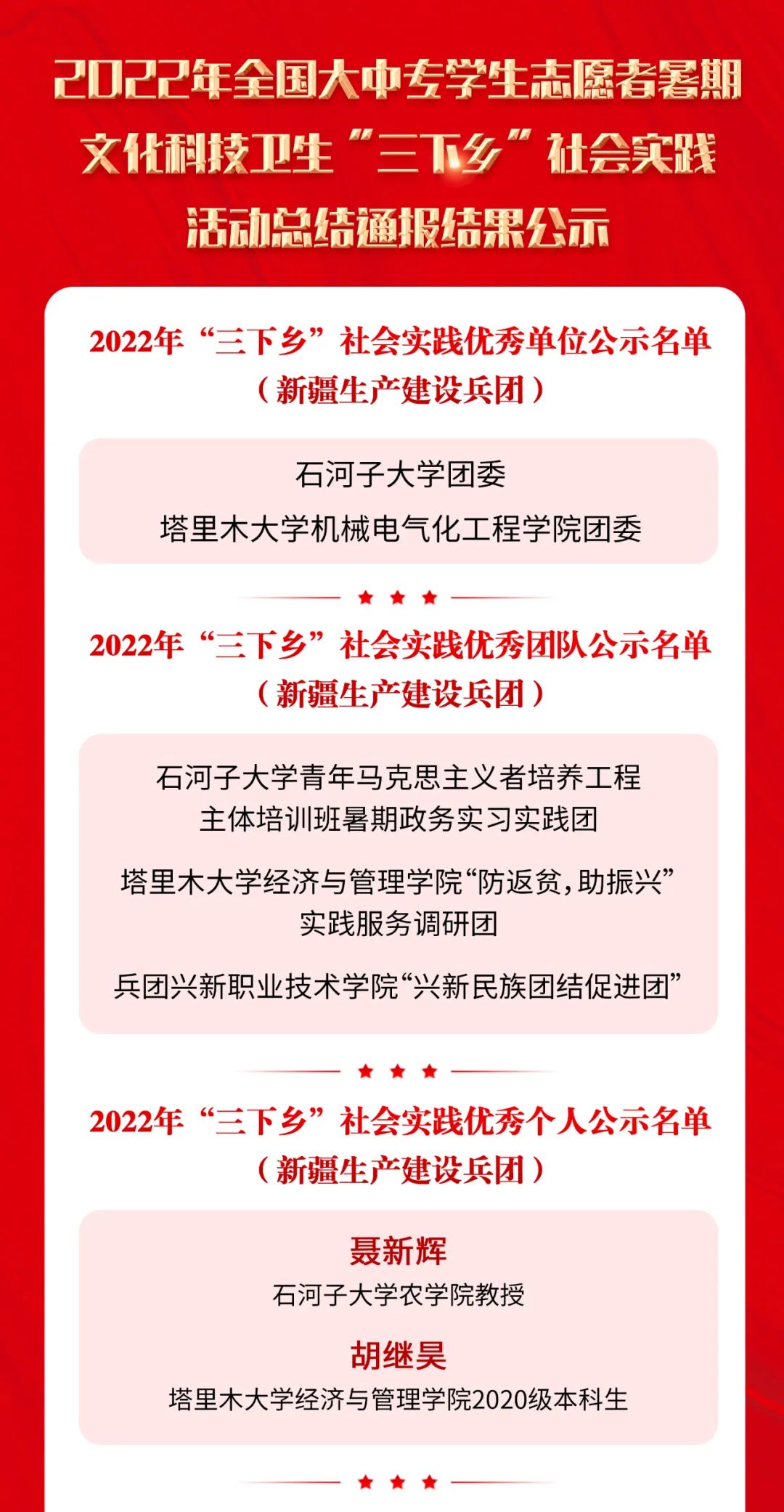为深入总结交流经验、选树典型宣传、推动引领示范、激励广泛参与、发挥育人实效,现通报表扬一批在2022年“三下乡”社会实践活动中表现突出的优秀集体、个人和项目,并通过新媒体平台广泛进行典型事迹做法宣传。经基层申报、省级团委审核推荐、组织评议等环节,最终确定290个“三下乡”社会实践优秀单位、379个“三下乡”社会实践优秀团队、198名“三下乡”社会实践优秀个人、58个“三下乡”社会实践优秀品牌项目。这些典型单位、团队、个人、项目的优秀材料将于10月中旬起在创青春新媒体平台逐步推出供学习交流。