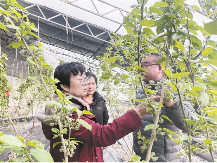 吴翠云(左一)为职工讲解桑葚种植技术(摄于2月4日)。张宇阳 摄