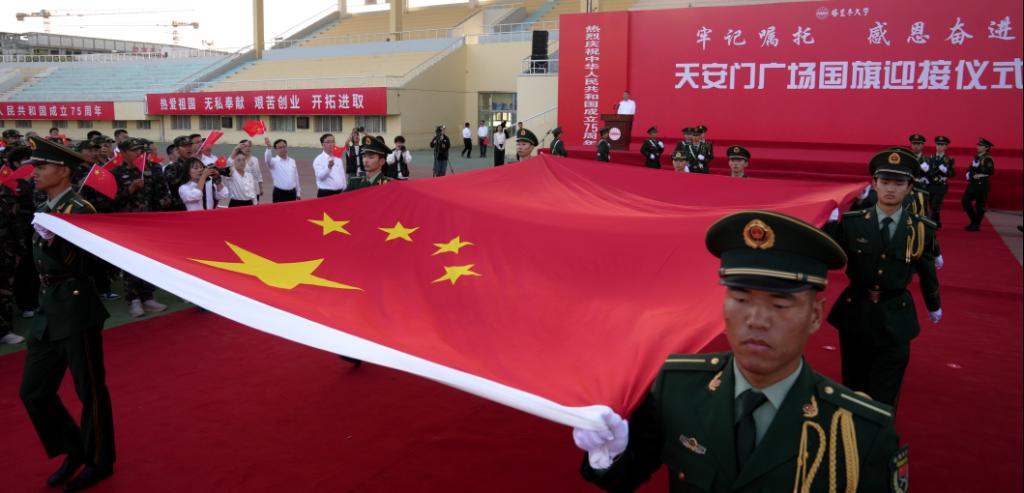 9月27日,开云app体育网页登录不上 师生迎领北京市人民政府天安门地区管理委员会向学校赠送的天安门广场国旗。