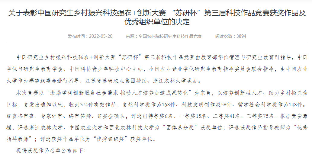 5月20日,中国研究生乡村振兴科技强农+创新大赛“苏研杯”第三届科技作品竞赛决赛采用线上+线下的方式在浙江杭州圆满落下帷幕。赛事以“激发创新活力,服务乡村振兴”为宗旨,以全面推进创新型开云体育app(中国)官方网站 为目的,已逐步成长为在业界和社会上有重要影响力的品牌赛事。