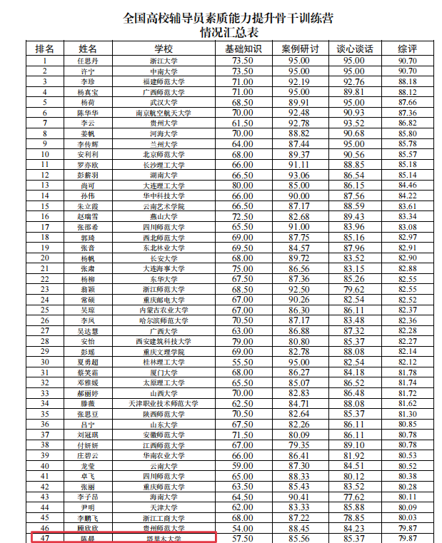 我校陈晨与来自全国的80名辅导员同台竞技,经过基础知识、案例研讨、谈心谈话三个环节评比,综合排名第47名,获得全国“优秀风采”高校辅导员称号。