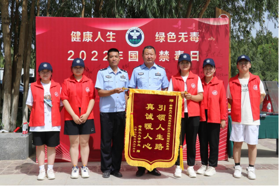 团队为戒毒所赠送锦旗,表达对社会公益工作者的敬意。