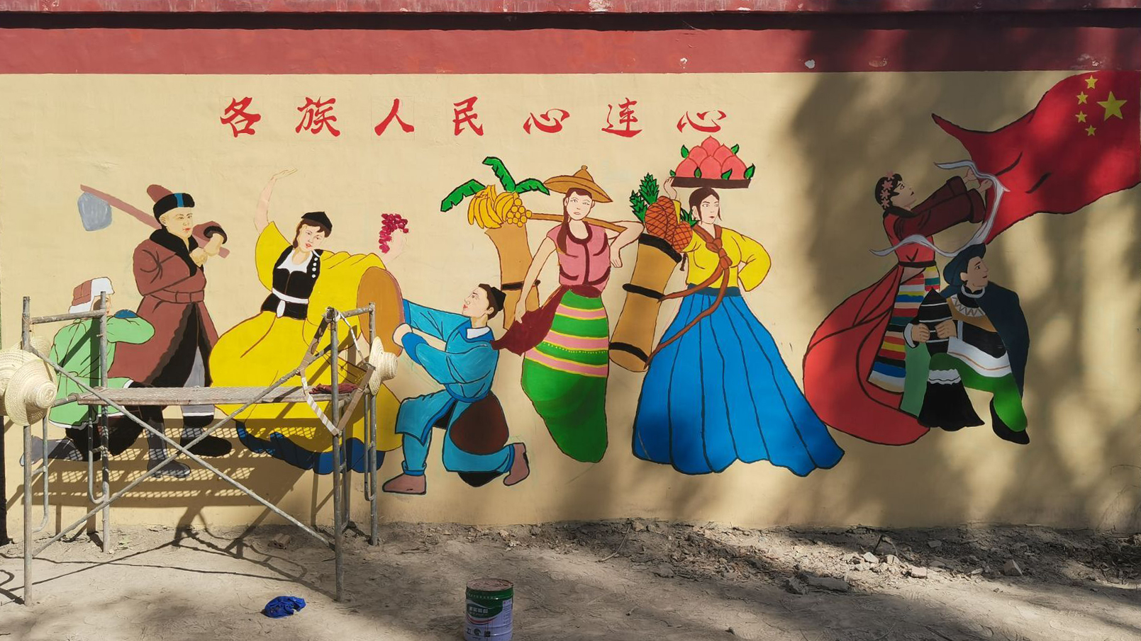 时值盛夏,烈日炎炎,队员们拿起画笔,戴上草帽,不畏酷暑,不拍困难,站在脚手架上描绘着一幅幅生动的画面,用实际行动践行着胡杨精神。绘画内容从皑皑白雪、到丰茂田野,每幅画都展现着各族人民心连心,每片景都描绘出中华儿女一家亲。