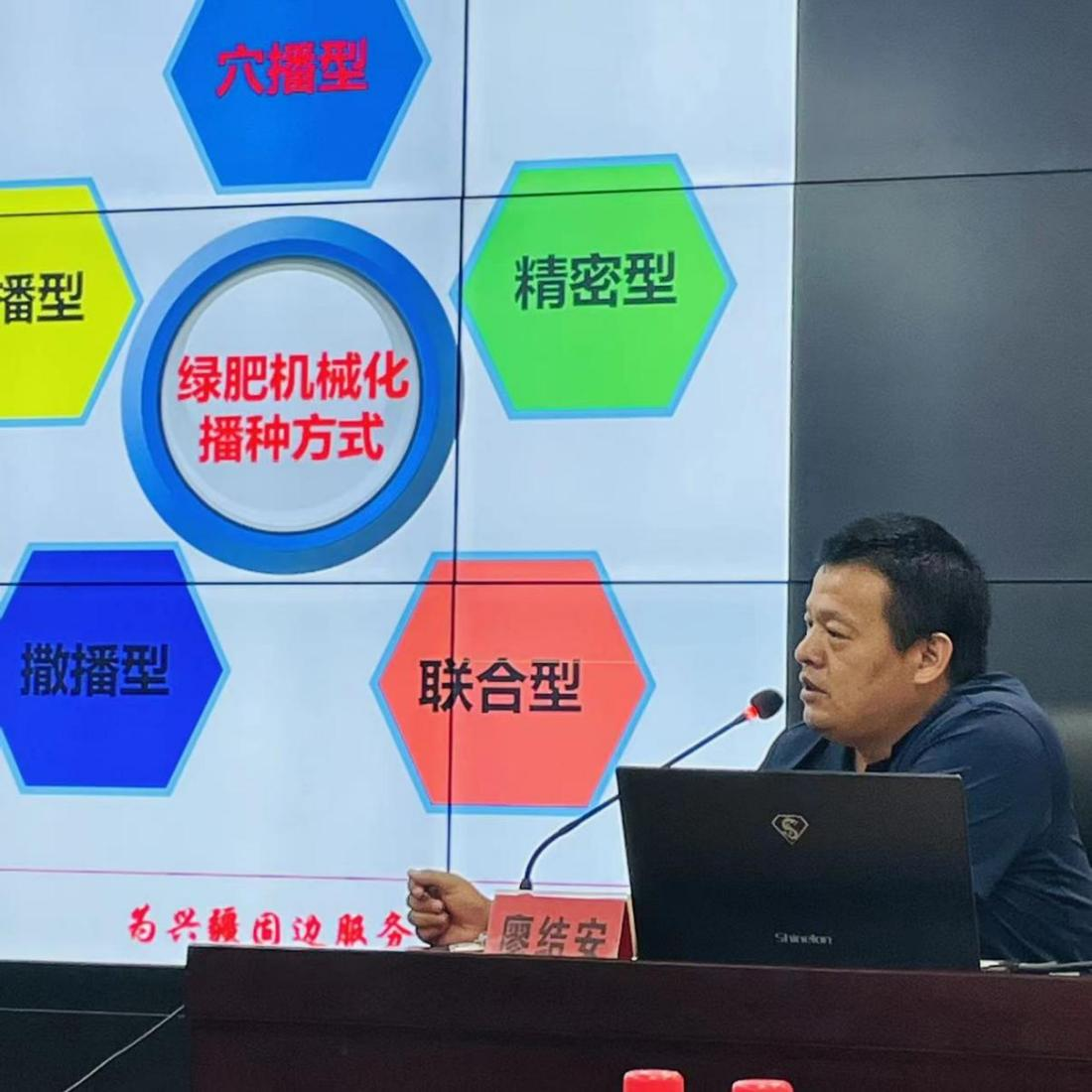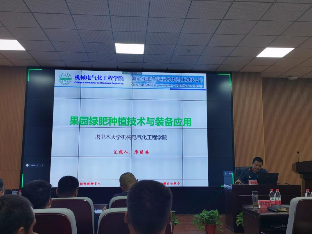 现场会结束后,针对兵团各师农机推广管理站及林果种植合作社,廖结安教授作了“果园绿肥种植技术与机械装备应用”学术报告,报告主要讲述果园绿肥种植意义、果园绿肥种植品种选用、果园绿肥种植模式、果园绿肥机具运用、绿肥+新疆特色林果发展趋势、绿肥+新疆特色林果成果案列;指出立足绿肥内源驱动土壤健康,创制调控产品,研发协同增效技术,构建绿肥与调控产品联合应用技术体系,实现农田养地、节肥、减排、控镉这一宗旨。