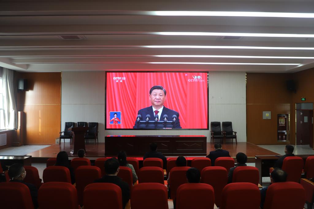 学院领导班子及办公室人员,学院第二届青马班学员代表,第72期入党积极分子代表,党员代表、团员代表在会议室、报告厅一起观看大会盛况。因疫情原因,部分教职工和学生在家或宿舍收听收看大会直播。