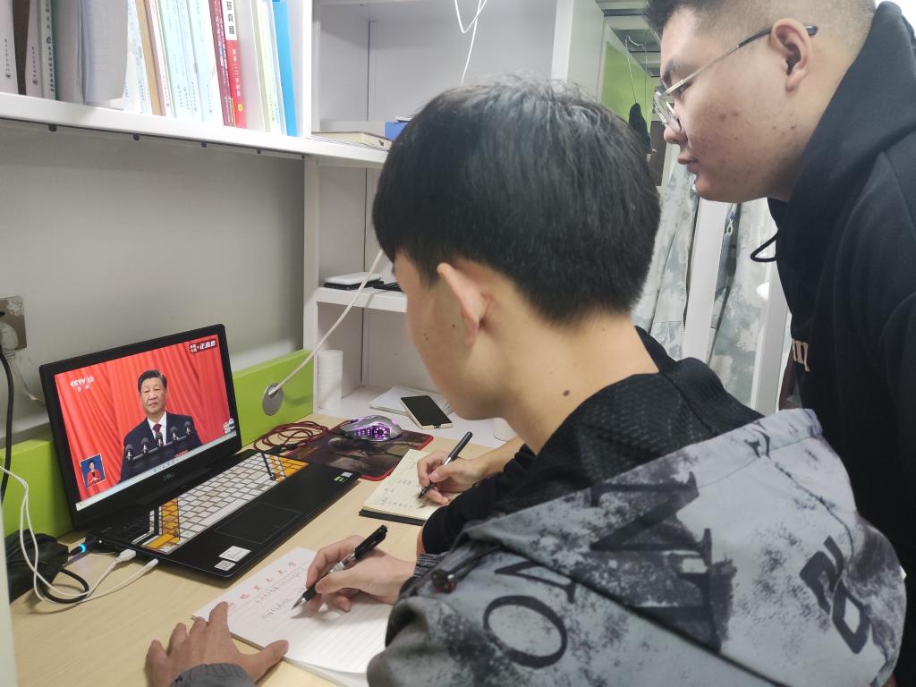 2022年10月16日上午,经管院在校学生在宿舍收看党的二十大开幕直播盛况。