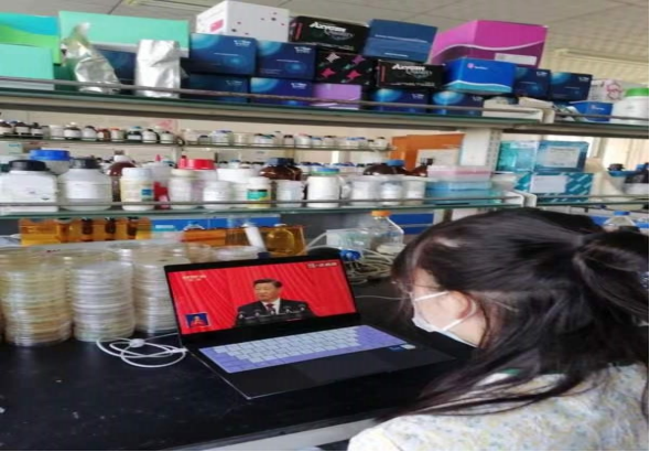 学院领导、中层干部、各支部委员及新进教师、研究生党支部分别在研发中心201、419会议室集中观看,在校教师在逸夫实验楼、研发中心、发酵工程等实验室收听收看。由于疫情影响,其余师生均在家收看。学院还以班级、团支部为单位组织学生进行了线上学习讨论,畅谈学习心得。