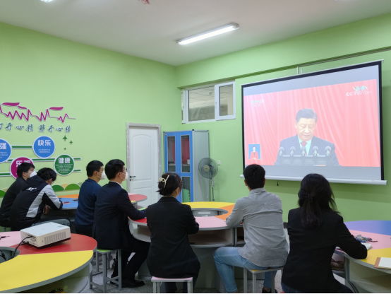 2022年10月16日上午,化工院学生党支部党员代表在芯胡杨心理工作室收看党的二十大开幕直播盛况。