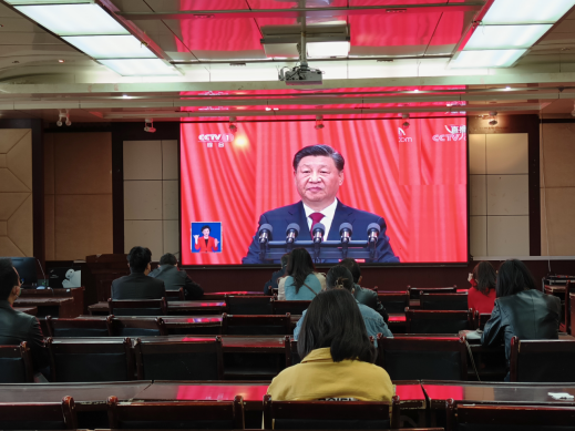 2022年10月16日上午,化工院党员干部集中在逸夫实验楼501会议室收看党的二十大开幕直播盛况。