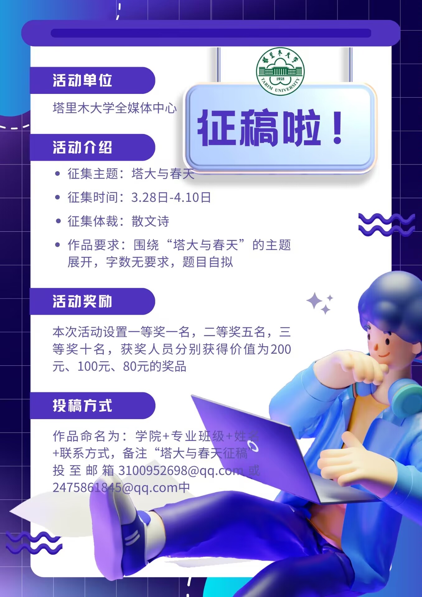 请将作品发送至电子邮箱:3100952698@qq.com;