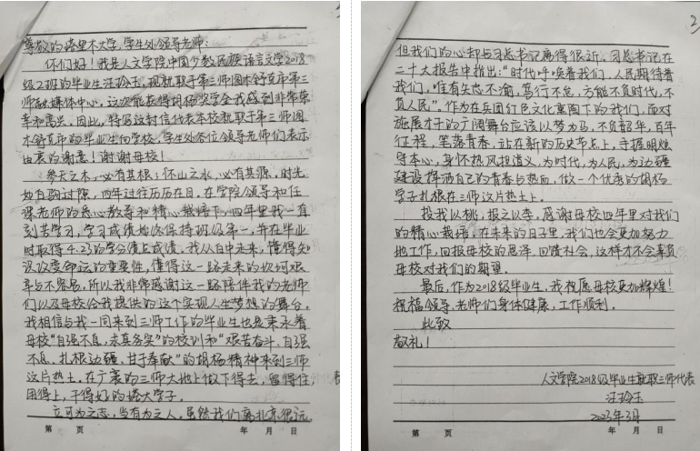 你们好!我是人文学院中国少数民族语言文学2018级2班的毕业生汪玲玉,现就职于第三师图木舒克市第三师融媒体中心。这次能够获得胡杨奖学金我感到非常荣幸和高兴。因此,特写这封信代表本校就职于第三师图木舒克市的毕业生向学校、学生处各位领导老师们表示由衷的谢意!谢谢母校!