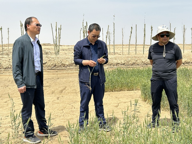 专家一行实地调研了园区盐碱地改良效果,查看冬小麦长势,就7000亩冬小麦抽穗扬花、灌浆期的肥料施用和“一喷三防”,以及1000亩飞播水稻田的出苗、灌水现状及后续工作进行了详细交流指导。重点针对小麦收获复播耐盐油葵、油菜、大豆等作物增加土壤有机质,改良土壤的盐碱措施,给出种植意见。