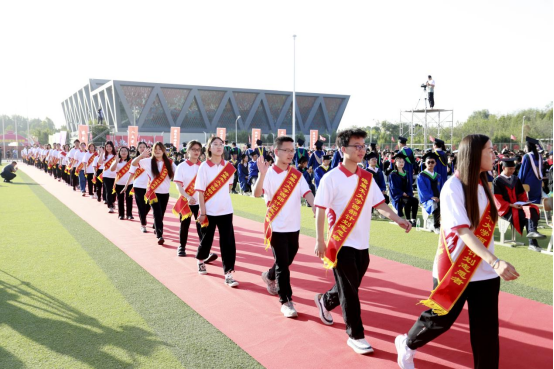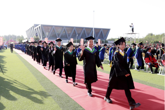 毕业生们身着毕业服,头戴毕业帽,有的整齐列队,有的成群结队,有的三三两两,大家都面带微笑,心情愉悦,信心十足,满怀期待,迎着飘扬的彩旗,陆续穿过毕业门,走进绿茵操场,迎接属于他们的大学最后一课——毕业典礼。