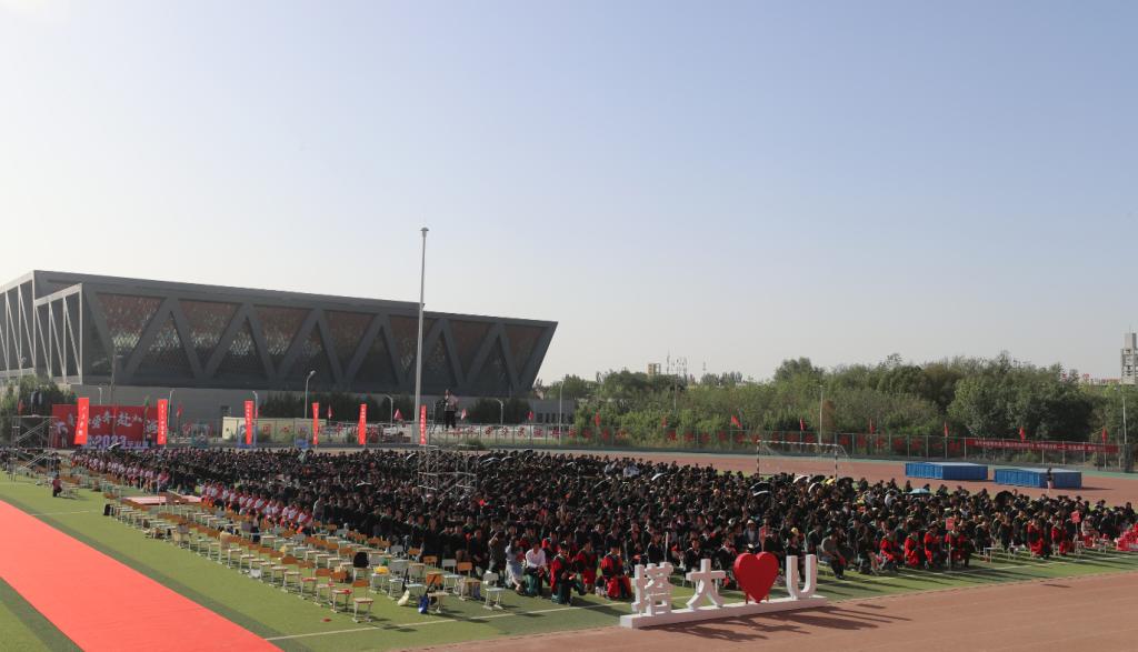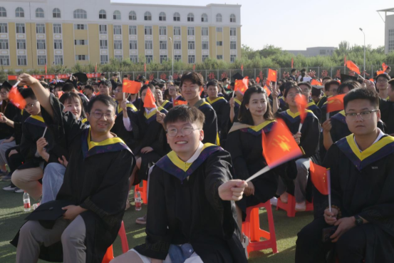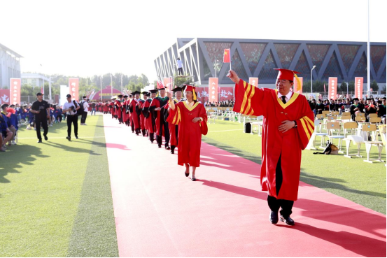 一条红地毯,在艳阳高照下,更加鲜红和耀眼,直至主席台。领导们、西部计划志愿者、优秀毕业生们,着装整齐,一边走在红地毯上,一边向毕业生打招呼。