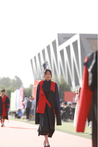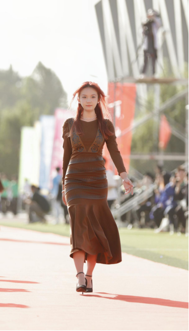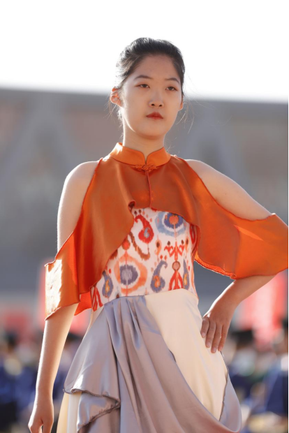 伴随着动感的歌声,“遇见”系列、“蔚然意”系列、“疆来”系列、“丝路云裳”系列、“鹤汀凫渚”系列、“尔雅”系列、“国风”系列等服饰相继亮相, 在百名学生的身上熠熠生辉。拂袖若如柳,一步一娉婷,皎若太阳升朝霞,灼若芙蕖出渌波,别开生面,引人入胜。