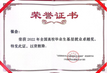“全国高校毕业生基层就业卓越奖”由教育部高校学生司、教育部学生服务与素质发展中心共同指导,中国教育发展基金会设立。旨在引导广大高校毕业生到基层逐梦青春、历练成才。经各高校组织推荐、各省级教育行政部门遴选推荐、奖励委员会审核确认,全国共有398名优秀高校毕业生获此殊荣。