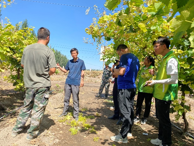 在八连等4个连队的田间地头,查看辣椒、西红柿、葡萄等特用经济作物的生长情况并进行现场指导,对该团各单位种植户田间管理的注意事项进行详细指导,赠送高效调节剂与特用农药农资。