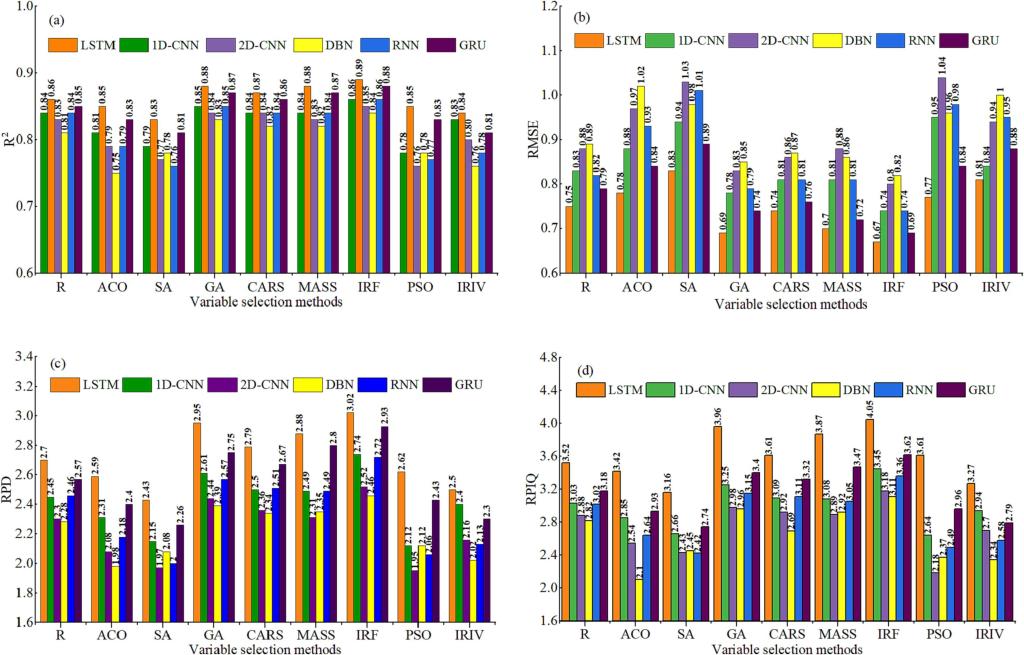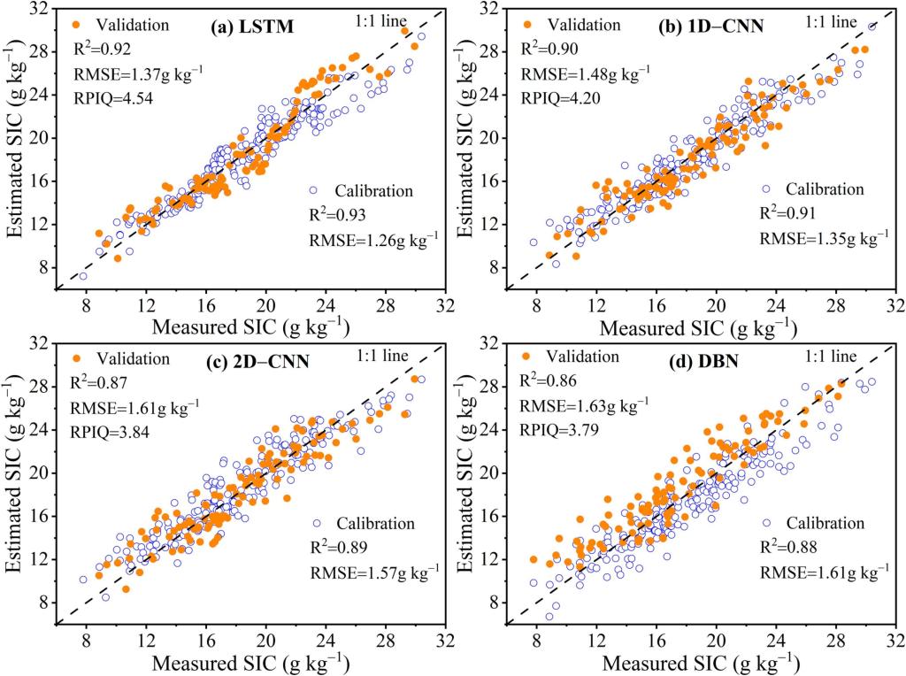 该文详细阐述了可见光近红外光谱技术检测土壤无机碳的能力。研究结果表明,变量选择算法可以显著提高土壤无机碳光谱估算精度,相应的估算精度依次为区间随机蛙跳(IRF)>迭代保留有效信息变量(IRIV)>粒子群算法(PSO)>竞争性自适应重加权算法(CARS)>蚁群算法(ACO)。四种深度学习模型都具有较高的预测精度,每种方法的建模精度依次为长短期记忆神经网络(LSTM)>一维卷积神经网络(1D-CNN)>二维卷积神经网络(2D-CNN)>深度置信网络(DBN)。区间随机蛙跳(IRF)和长短期记忆神经网络(LSTM)组合模型的估算精度最高(校准数据集的R2= 0.93,RMSE = 1.26 g kg-1;验证数据集的R2= 0.92,RMSE = 1.37 g kg-1)。这项研究表明,深度学习与变量选择算法相结合,可以快速、准确地检测出土壤无机碳含量。