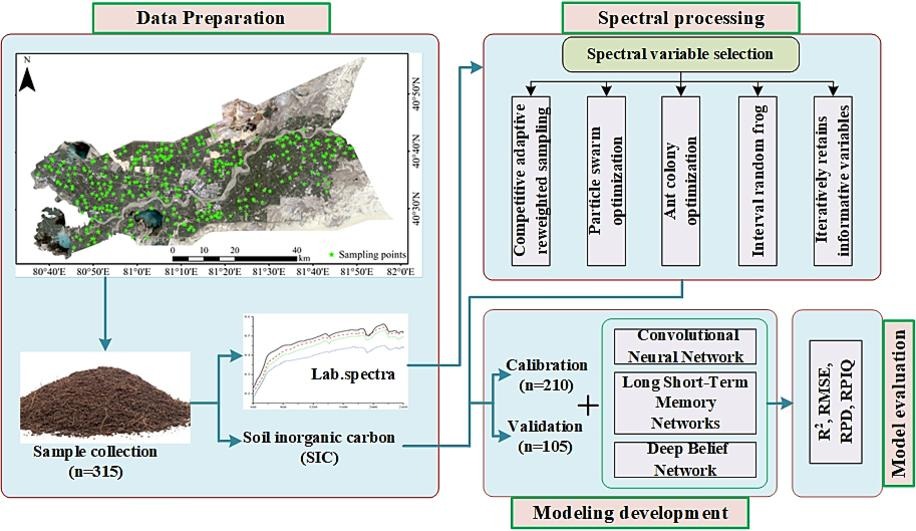 彭杰教授作为通讯作者、硕士研究生白子金作为第一作者,在《Geoderma》(SCI,中科院一区Top,IF=6.1)在线发表了题为“Estimation of soil inorganic carbon with visible near-infrared spectroscopy coupling of variable selection and deep learning in arid region of China(利用可见近红外光谱耦合变量选择和深度学习估算中国干旱地区土壤无机碳含量)”的研究成果。