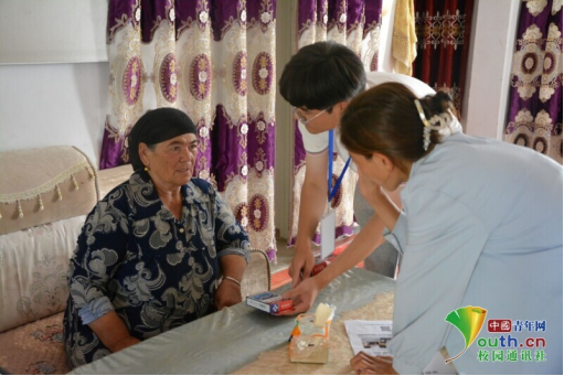 图为实践团队员走访入户向乡村居民发放眼部健康药品的画面。中国青年网通讯员屈越供图