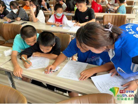 图为团队成员为台下的青少年发放有关心理健康的调查问卷且青少年认真填写调查问卷。中国青年网通讯员黄军星供图