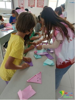 图为团队成员在教小朋友们折纸。中国青年网通讯员努尔比亚木·依木拉尼 供图