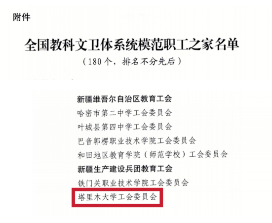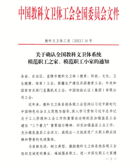 近日,中国教科文卫体工会全国委员会下发了《关于确认全国教科文卫体系统模范职工之家、模范职工小家的通知》,决定选树180个单位为全国教科文卫体系统模范职工之家。我校工会委员会荣获全国教科文卫体系统模范职工之家称号。