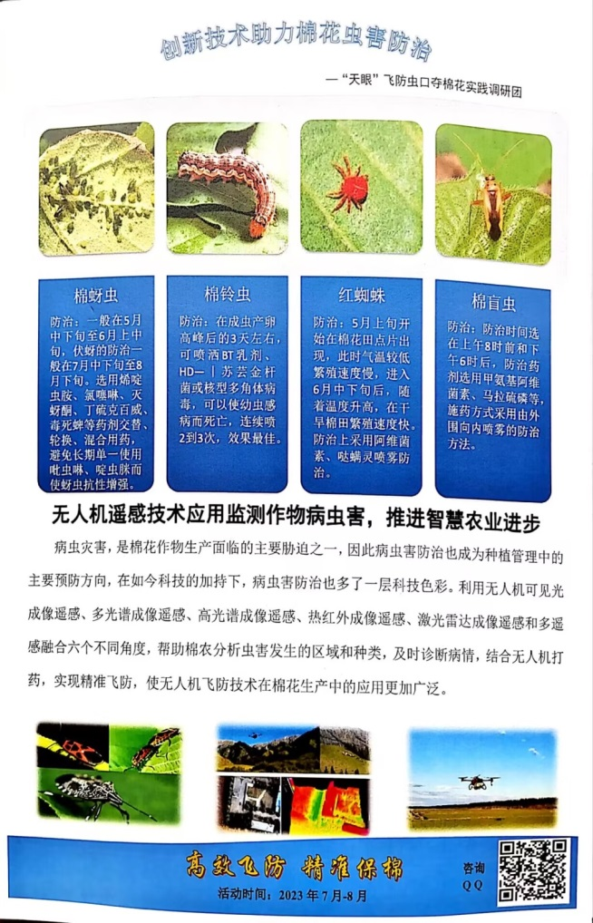 针对该连队棉花生产管理面临的问题,团队整理并印刷“棉花病虫害防治手册”和“无人机精准飞防手册”,采用线下指导和现场演示相结合的方式,全面助力棉农提高棉花栽培技能、水肥管理能力和病虫害防治水平。