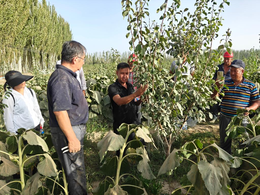 在西梅示范地里,张琦教授以理论培训+现场教学的方式为农户讲解果树生长相关技术,帮助农户掌握林果管理技术,为林果产业提质增效打下坚实基础。