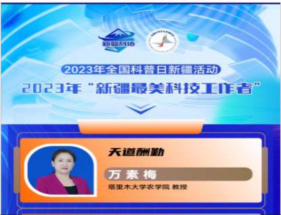 9月17日,自治区科协公布2023年“新疆最美科技工作者”名单,我校农学院万素梅教授荣获2023年“新疆最美科技工作者”。