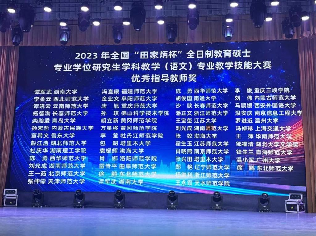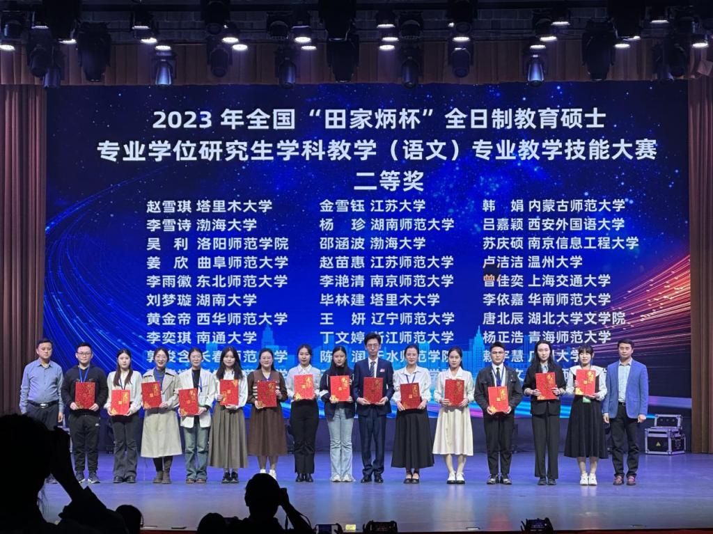 10月14日,2023年全国“田家炳杯”全日制教育硕士专业学位研究生学科教学(语文)专业教学技能大赛决赛在长春师范大学圆满结束。来自北京师范大学、华东师范大学、东北师范大学等全国107所院校的153名选手进入决赛,经过激烈角逐,我校人文学院研究生赵雪琪、毕林建荣获二等奖,教师包朗、张兴田被评为优秀指导教师。