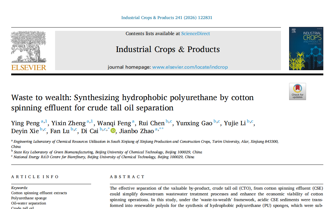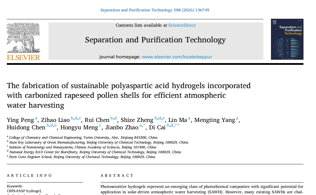 近日,我校化学化工学院材料工程专业2023级硕士研究生彭颖以第一作者在国际Top期刊《Industrial Crops & Products》(中科院一区Top,影响因子6.2)和《Separation and Purification Technology》(中科院二区Top,影响因子9)分别发表题为“Waste to wealth: Synthesizing hydrophobic polyurethane by cotton spinning effluent for crude tall oil separation”和“The fabrication of sustainable polyaspartic acid hydrogels incorporated with carbonized rapeseed pollen shells for efficient atmospheric water harvesting”的研究论文。化学化工学院赵俭波教授为通讯作者,北京化工大学蔡的教授为共同通讯作者。本研究得到国家自然科学基金、兵团财政科技计划、开云app体育网页登录不上