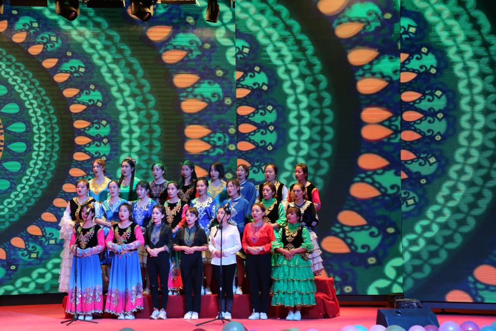 第二篇章为胡杨情,少数民族代表队身着精美服装,优美的《沙枣树》和《塔里木河》,赞扬了沙枣树不畏艰难困阻和塔里木河无私哺育一代代兵团人的兵团精神和胡杨精神。