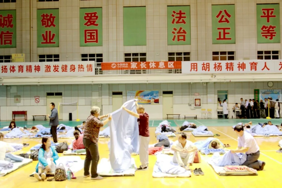 由于夜间到校新生较多,陪同家长的人数超过了校方的预计。学校本着对每一位学生家长认真负责的态度,在凌晨一点左右又紧急抽调了300张铺位以供家长们休息。