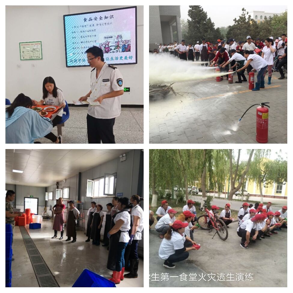 饮食服务中心、商贸服务中心组织员工,通过观看视频、处领导安全生产公开课、邀请阿拉尔市市场监督管理局相关专家进食堂等多种形式,进行食品安全生产知识的学习与培训,规范食品安全生产各环节和操作流程,并对食品安全生产专项督查,进一步强化食品安全生产管理,对各食堂的厨师、服务员和摊位进行消防安全知识培训,重点介绍了防火、防电及相关险情处置预案,并进行了灭火实际操作演练。